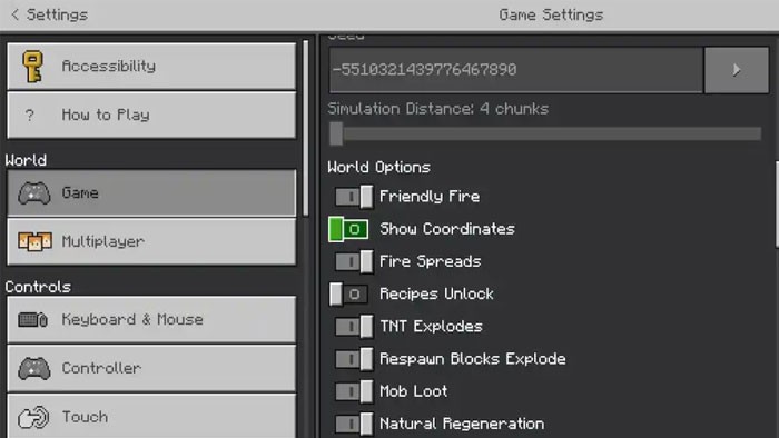 Khi công tắc bên cạnh mục Show Coordinates chuyển sang màu xanh lá cây, tọa độ đã được bật cho thế giới đó.