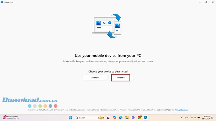 Sau khi ứng dụng Phone Link được mở, hãy chọn thiết bị Android hoặc iOS mà bạn muốn kết nối.