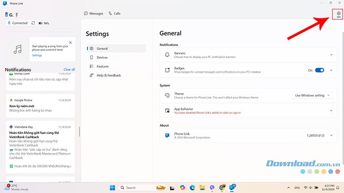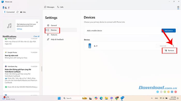 Quá trình loại bỏ thiết bị hoặc ngắt liên kết giữa điện thoại và máy tính Windows thông qua ứng dụng Phone Link được thực hiện theo các bước sau:
