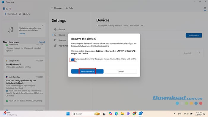 Bước 3: Đánh dấu vào ô xác nhận "I understand removing this device means I’m resetting Phone Link on this PC". Cuối cùng, nhấn vào nút Remove device để hoàn tất quá trình.