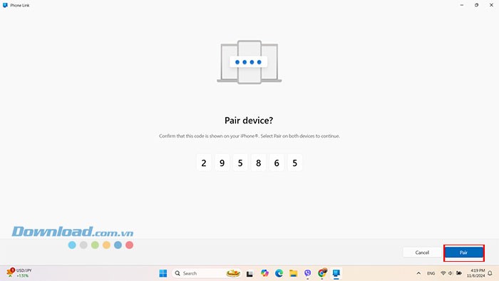 Tiếp theo, nhập mã PIN hiển thị trên màn hình khi được yêu cầu Pair device? và nhấn Pair để xác nhận.