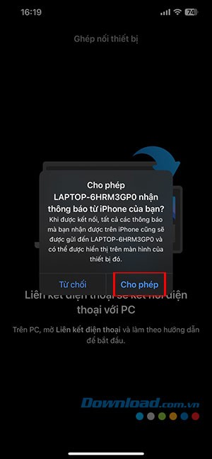 Nhấn Cho phép trên điện thoại để cấp quyền cho máy tính truy cập thông báo, cuộc gọi và các dữ liệu khác.