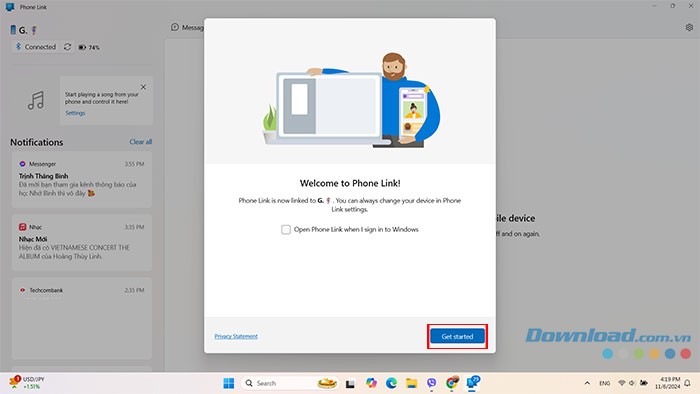 Khi điện thoại và máy tính Windows đã kết nối thành công, nhấn Get Started để bắt đầu khám phá và tận hưởng các tính năng của Phone Link.