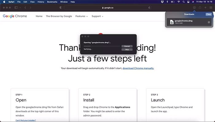 Bước 2: Sau khi quá trình tải xuống hoàn tất, bạn sẽ tìm thấy tệp googlechrome.dmg trong thư mục Tải xuống của Safari, thường nằm ở góc trên cùng bên phải màn hình.