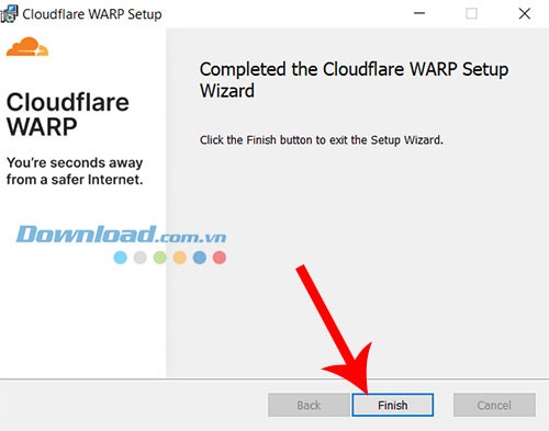 Bước 5: Thực hiện theo các hướng dẫn trên màn hình và nhấn Finish để kết thúc quá trình cài đặt. Cloudflare WARP sẽ tự động khởi động và hiển thị biểu tượng trên thanh menu.