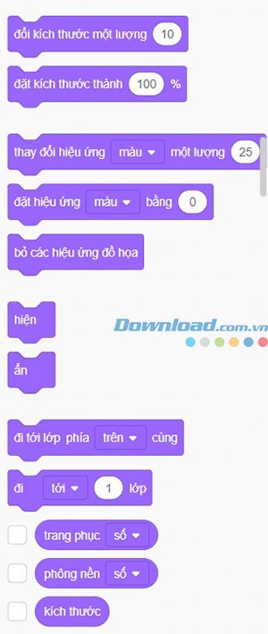 Các khối màu tím cho phép thay đổi diện mạo của nhân vật, bao gồm việc thay đổi trang phục, ẩn/hiện Sprite và điều chỉnh kích thước của nó. Chúng kiểm soát cách Sprite xuất hiện trên sân khấu, với 20 khối khác nhau.