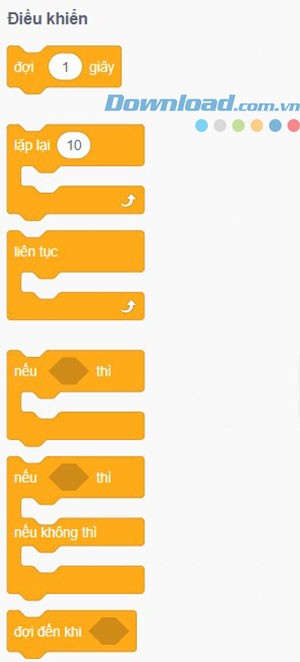 Với các khối này, người dùng có thể khiến nhân vật thực hiện các hành động theo một trình tự nhất định hoặc lặp lại các hành động cho đến khi đáp ứng một điều kiện cụ thể. Chúng đóng vai trò "điều khiển" và cải thiện hiệu suất của dự án.
