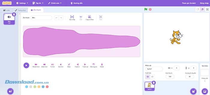 Phần này cho phép thêm âm thanh vào chương trình, tạo ra trải nghiệm tương tác và sống động hơn. Mỗi Sprite có thể có âm thanh riêng, hoặc người dùng có thể thêm âm thanh tùy chỉnh từ thư viện hoặc tệp tin.