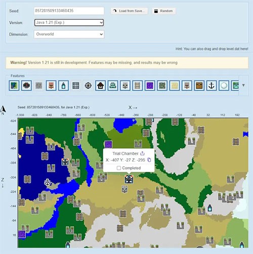 Bản đồ seed sẽ hiển thị tọa độ của các Trial Chambers (được đánh dấu bằng biểu tượng Trial Spawners). Người chơi có thể sao chép tọa độ và sử dụng lệnh dịch chuyển như đã hướng dẫn trước đó.