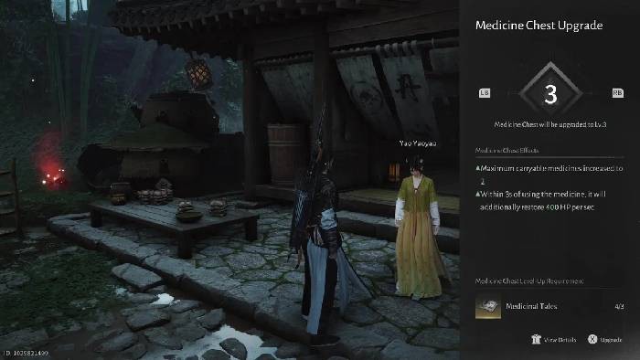Để tiến hành nâng cấp, hãy đến Evercare Clinic ở phía Tây Qinghe, gặp gỡ Yao Yaoyao và chọn tùy chọn nâng cấp Medicine Chest. Sau đó, nộp tất cả các Medicinal Tales mà bạn đang sở hữu để tăng dung lượng thuốc có thể mang theo và nâng cao hiệu quả của mỗi lần hồi máu.