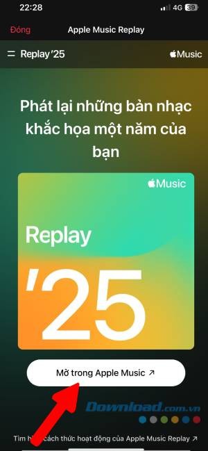 Để có thể nghe lại những bài hát được yêu thích, hãy cuộn xuống cuối trang và chạm vào Mở trong Apple Music. Bạn sẽ được chuyển hướng về ứng dụng Apple Music, nơi playlist Replay 2025 đã sẵn sàng để bạn thưởng thức.