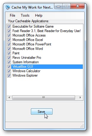 Khi kích hoạt CacheMyWork, chương trình sẽ tự động liệt kê tất cả các ứng dụng đang mở. Bạn chỉ cần chọn những ứng dụng mà bạn muốn khôi phục sau khi hệ thống khởi động lại.