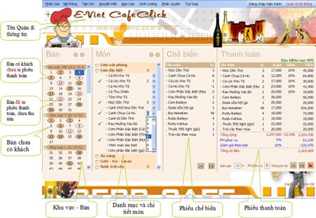 Phần mềm CafeClick sở hữu giao diện thân thiện, trực quan, hỗ trợ người dùng theo dõi tình trạng của mọi bàn trong từng khu vực một cách dễ dàng. Các thao tác như đặt món, tạo phiếu chế biến, chuyển đổi bàn, gộp bàn và thanh toán đều được thực hiện một cách nhanh chóng và hiệu quả.