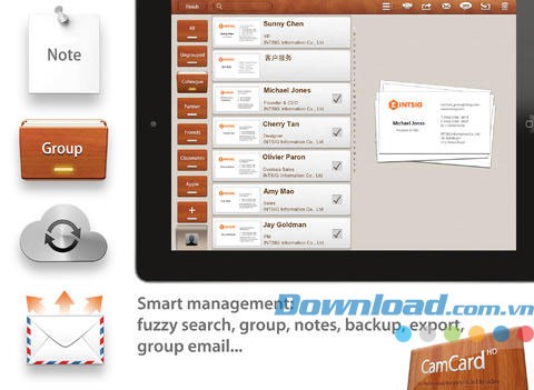 CamCard HD Free for iPad cho phép người dùng tìm kiếm, sắp xếp, nhóm hoặc kết hợp các danh thiếp, đồng thời thiết lập mật khẩu để bảo vệ trình quản lý danh thiếp.