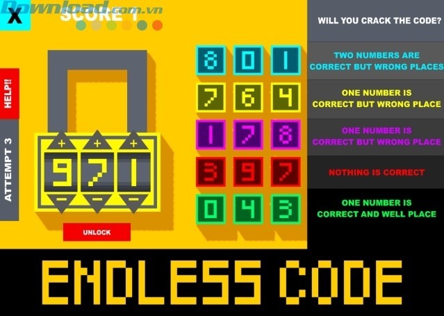 Can You Crack The Code là một game trí tuệ được thiết kế với giao diện trực quan, sinh động, mang đến những giờ phút giải trí vừa thử thách, vừa thú vị. Trò chơi này sẽ đánh giá khả năng suy luận của bạn thông qua việc tìm ra bộ ba số chính xác, dựa trên 5 gợi ý được cung cấp để mở khóa và tích lũy điểm.