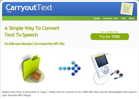 CarryOutText là một công cụ đơn giản, cho phép bạn chuyển đổi văn bản sang định dạng âm thanh MP3 chỉ với hai bước thực hiện nhanh chóng.