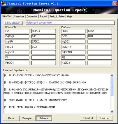 Việc cân bằng các phương trình hóa học trở nên nhanh chóng hơn bao giờ hết. Chỉ cần nhập các chất phản ứng và sản phẩm, hoặc thậm chí các phương trình phức tạp như: