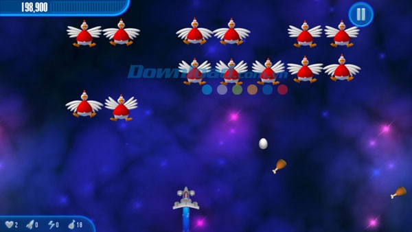 Gà sẽ xuất hiện theo từng đợt, liên tục thay đổi sau khi bạn tiêu diệt hoàn toàn một đàn. Mặc dù phải đối mặt với cuộc chiến một mình, bạn không hề đơn độc nhờ sự hỗ trợ của nhiều loại vũ khí khác nhau được trang bị trên tàu bay.