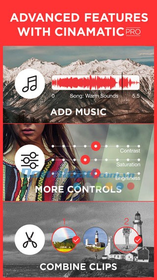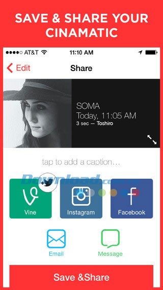 Cinamatic, ứng dụng hoàn toàn miễn phí dành cho iPhone, iPad hoặc iPod Touch, cho phép người dùng ghi lại nhiều đoạn clip ngắn và biên tập chúng thành những thước phim ngắn ấn tượng. Sau đó, các video Cinamatic có thể được chia sẻ trực tiếp lên các nền tảng phổ biến như Instagram , Vine hoặc Facebook .