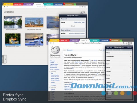Khác với các trình duyệt khác chỉ hỗ trợ tải lên dữ liệu một chiều lên Dropbox, CloudSurfer Free cung cấp tính năng đồng bộ hóa hai chiều thực sự. Tất cả các file tải xuống sẽ được tự động đồng bộ hóa với tài khoản Dropbox của bạn. Trình quản lý file tích hợp sẵn cho phép bạn xem tài liệu, hình ảnh và phát các file đa phương tiện trực tiếp từ Dropbox.