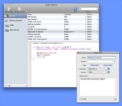 Công cụ này được thiết kế như một kho lưu trữ lý tưởng cho những đoạn mã nguồn quan trọng. Code Collector Pro hỗ trợ đa dạng các ngôn ngữ lập trình phổ biến, bao gồm HTML, Cocoa, C++, Ruby và nhiều ngôn ngữ khác.