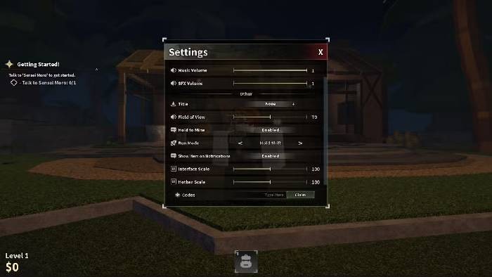 Bước 3: Trong cửa sổ Settings, bạn cần kéo xuống dưới cho đến khi tìm thấy mục Codes. Tiếp theo, hãy nhập chính xác hoặc sao chép mã code đã được cung cấp vào ô Type Here. Cuối cùng, nhấn vào nút Redeem để nhận phần thưởng.