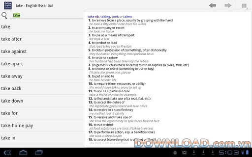 Collins English Essential TR for Android là một ứng dụng từ điển tiếng Anh mạnh mẽ, được thiết kế dành riêng cho hệ điều hành Android. Ứng dụng này cung cấp một nguồn tài nguyên ngôn ngữ phong phú với 123.000 mục từ và hơn 200.000 định nghĩa chi tiết.