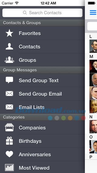 Xem toàn bộ danh sách liên lạc, bất kể nguồn gốc từ iCloud, CardDAV, Facebook, Exchange, hoặc các tài khoản liên lạc khác.