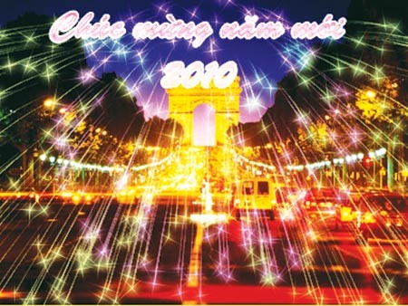 Bấm phím F2, mở bảng EasyPalette, lần lượt click vào tab Galleries, rồi biểu tượng Galleries ngay dưới, chọn menu Text Style trong bảng menu phụ xổ xuống. Click đúp vào mẫu có tên “G05” bên phải bảng EasyPalette, để gõ chữ có dấu phải chỉnh bộ gõ chữ tương ứng rồi click chuột vào vị trí muốn gõ chữ trên hình, nhập vào hai hàng “Chúc mừng năm mới” và “2010”, chỉnh ngay ngắn, rồi chọn Alignment > Align to the center trên thanh thuộc tính để số “2010” nằm giữa, xong bấm phím F3 mở bảng Layer Manager, click chọn Layer trên cùng, nhấn chuột phải, chọn menu Merge All.