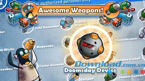 Crazy Penguin Wars: Tiny Duels sở hữu một hệ thống vũ khí phong phú, đa dạng, cho phép lựa chọn các loại vũ khí như Void Generator, Mega Nuke, Napalm, Flak Missile, Molotov…