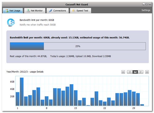 Net Guard cho phép bạn thiết lập giới hạn sử dụng dữ liệu hàng tháng. Phần mềm sẽ tự động tính toán mức tiêu thụ băng thông dự kiến, giúp bạn dễ dàng dự đoán và kiểm soát chi phí.