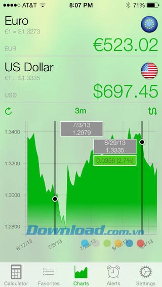 Currency+ Free for iOS cung cấp các biểu đồ lịch sử. Người dùng có thể xem biểu đồ thể hiện sự biến động tỷ giá giữa hai đơn vị tiền tệ bất kỳ.
