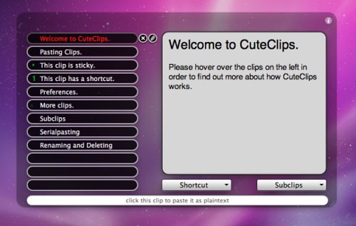 Bạn có thể kích hoạt CuteClips 3 thông qua thanh menu hoặc sử dụng phím nóng. Phím nóng mặc định là Cmd-Shift-V, tuy nhiên, bạn hoàn toàn có thể tùy chỉnh theo sở thích cá nhân.