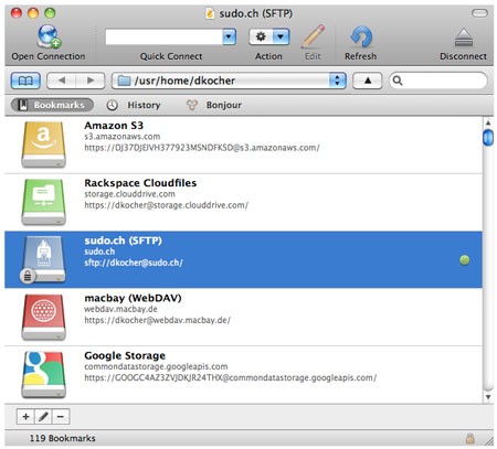 Ngoài ra, Cyberduck còn cho phép nhập bookmark từ các ứng dụng khác, kiểm tra lịch sử kết nối đến các máy chủ, hiển thị thời gian truy cập gần nhất và tự động phát hiện các dịch vụ FTP, WebDAV trên mạng nội bộ.