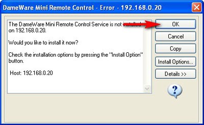Trong lần kết nối đầu tiên đến máy Remote, nếu Agent Service chưa được cài đặt, DWMRC sẽ tự động cài đặt nó. Một hộp thoại sẽ thông báo rằng Agent Service chưa được cài đặt và hỏi bạn có muốn cài đặt hay không.