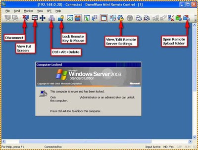 Trên cửa sổ chính của chương trình là màn hình của máy Remote. Nếu máy Remote đang ở chế độ logoff, bạn có thể gửi lệnh tương ứng tổ hợp phím Ctrl + Alt + Delete để đăng nhập vào hệ thống và thực hiện công việc. Các tính năng quan trọng trên cửa sổ chính của DWMRC bao gồm: