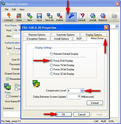 Trên hộp thoại Properties, chọn tab Mirror Driver. Trong tab này, bạn có thể cấu hình độ phân giải màu của desktop trên máy Remote để hiển thị trên máy Local và cấu hình mức nén ảnh. Điều chỉnh các giá trị để phù hợp với tốc độ mạng: