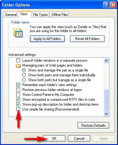 Trong hộp thoại Folder Options, chọn tab View. Dịch chuyển thanh cuộn của Advanced settings xuống cuối cùng và bỏ chọn Use simple file sharing. Sau đó nhấp OK để xác nhận.