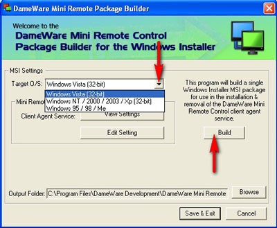 Trên hộp thoại DameWare Mini Remote Package Builder, chọn hệ điều hành sử dụng trên máy Remote, sau đó nhấp nút Build để tạo gói cài đặt. Với Windows NT/2000/XP/2003, sẽ tạo file DWRCS32.MSI, với Vista, sẽ tạo file DWRCSVista32.MSI trong Output Folder. Các file này khá nhỏ (khoảng 860Kb) và có thể copy sang các máy Remote để thực hiện việc cài đặt trên đó. Để gỡ bỏ Agent Service trên máy Remote, trên giao diện chính của chương trình DWMRC, chọn menu File > Remove Service. DWMRC ngoài việc hỗ trợ giao thức riêng là MRC Mini Driver, nó cũng hỗ trợ giao thức RDP để kết nối với Remote Desktop có sẵn trên XP, Vista hoặc Terminal Service có sẵn trên Windows 2000/2003. Trong trường hợp máy Remote đã cấu hình sẵn Remote Desktop hoặc Terminal Service, trên hộp thoại Remote Connect có thể lựa chọn tính năng này để thực hiện kết nối mà không cần phải cài MRC Mini Driver trên máy Remote.