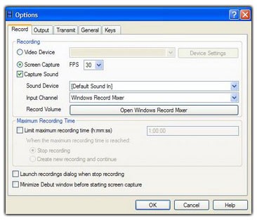 Mặc định, Debut sẽ quay video với định dạng avi và tốc độ 30 fps. Để thay đổi định dạng và tốc độ quay, bạn có thể truy cập vào Options từ Menu.
