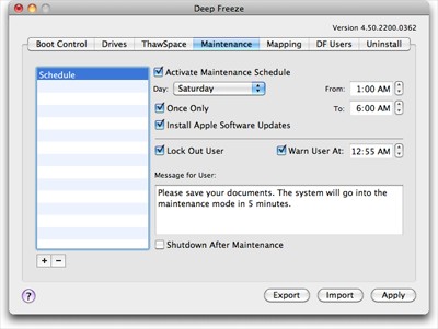 Khả năng tùy biến cao: người quản lý có thể dễ dàng cài đặt các chế độ và lịch bảo dưỡng theo lịch hoặc không định kỳ. Chương trình tương thích với chức năng Apple Remote Desktop.