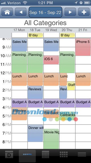 Hỗ trợ 5 chế độ hiển thị lịch khác nhau: ngày, tuần, tháng, năm và danh sách.