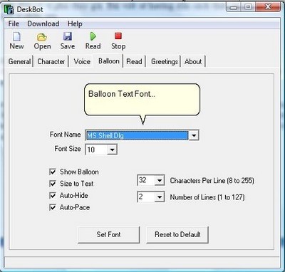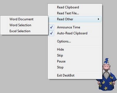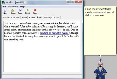 Deskbot là một tiện ích miễn phí, cho phép bạn tạo ra một người bạn ảo trên màn hình desktop. Người bạn này sẽ luôn đồng hành cùng bạn mỗi khi bạn sử dụng máy tính. Bạn có thể yêu cầu nó đọc các đoạn văn bản đã sao chép vào clipboard, nội dung của một file văn bản, hoặc thông báo thời gian…