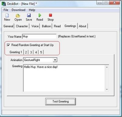 Phần mềm cho phép bạn thiết lập 5 kiểu chào mừng khác nhau, tương ứng với các tab 1, 2, 3, 4, 5 mà bạn thấy ở trên hình. Đánh dấu vào mục Read Random Greeting at Start Up để mỗi lần hệ thống khởi động, phần mềm sẽ sử dụng một trong 5 cách chào mừng khác nhau, nhằm tăng tính ngộ nghĩnh và tránh sự nhàm chán.