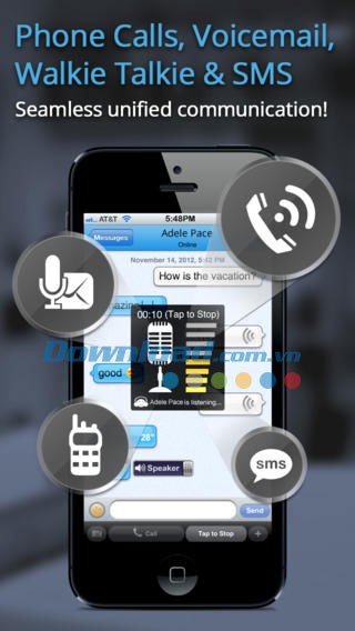 Bạn cảm thấy bất tiện khi phải gõ tin nhắn trên màn hình nhỏ của iPhone? Dingtone sẽ biến chiếc điện thoại của bạn thành một chiếc máy bộ đàm thực thụ, chỉ cần nhấn nút và bắt đầu trò chuyện. Tính năng này mô phỏng một radio hai chiều, với hộp thư thoại hiển thị phù hợp với giao diện thiết bị.