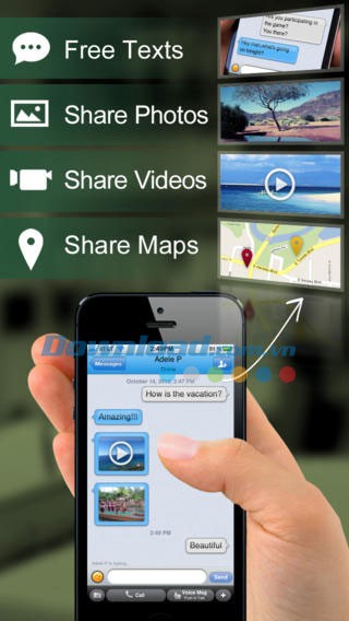 Dingtone for iOS cho phép chia sẻ video, hình ảnh, phác thảo, tệp nhạc, dữ liệu vị trí với bạn bè và người thân thông qua danh bạ tích hợp trong ứng dụng.