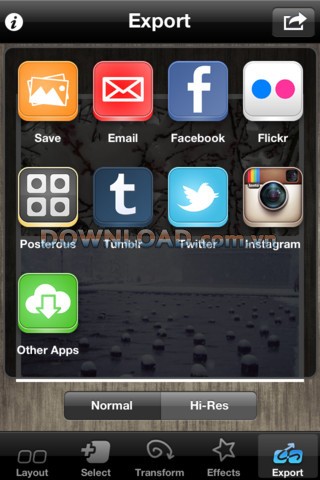 Ứng dụng còn cung cấp khả năng chia sẻ dễ dàng những bức ảnh đã chỉnh sửa với bạn bè và người thân thông qua nhiều nền tảng khác nhau, bao gồm email, Facebook, Twitter, Flickr, Tumblr và Posterous.