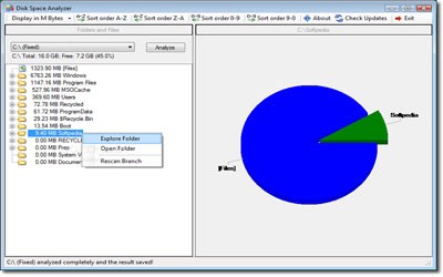 Chỉ với một cú nhấp chuột vào ký tự ổ đĩa, Disk Space Analyzer sẽ bắt đầu quá trình phân tích không gian của ổ đĩa đó. Kết quả sẽ hiển thị danh sách đầy đủ các tập tin và thư mục, được sắp xếp theo tên hoặc kích thước.