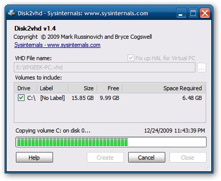 Nếu bạn tạo VHD từ Windows XP hoặc Server 2003 và dự định chạy nó trên Virtual PC, hãy tích vào ô Fix up HAL for Virtual PC. Sau khi cấu hình xong, nhấn nút Create để bắt đầu quá trình chuyển đổi.