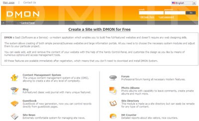 Dmon là một dịch vụ tạo website trực tuyến được xây dựng trên nền tảng web 2.0, tích hợp các công cụ thông minh như Control Panel, Site menu builder, Visual HTML editor, cùng nhiều module hữu ích như Page Editor, Forum, Site News, Blogs, Hit Counter,… giúp bạn nhanh chóng tạo ra một website chuyên nghiệp.